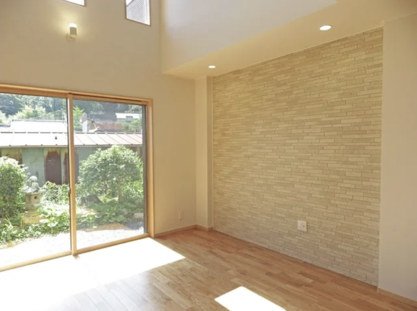 リビングのTV裏はタイル調のデザインウォールでアクセントを♪