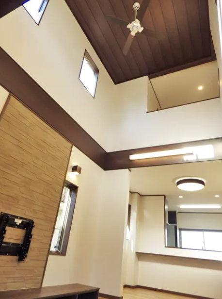 リビングの吹抜け天井にダイニングとのスキップフロアで