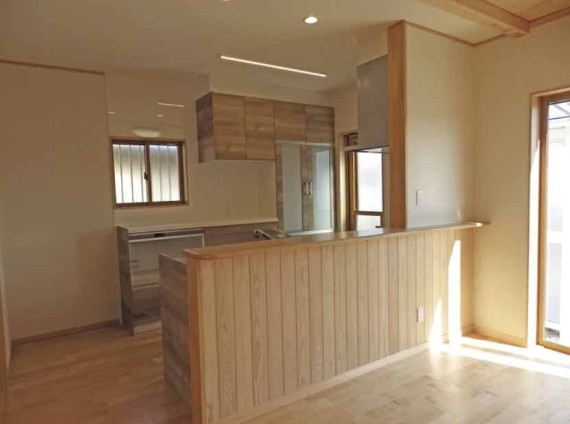 キッチンカウンター下にも杉板張りをしてアクセントを♪
