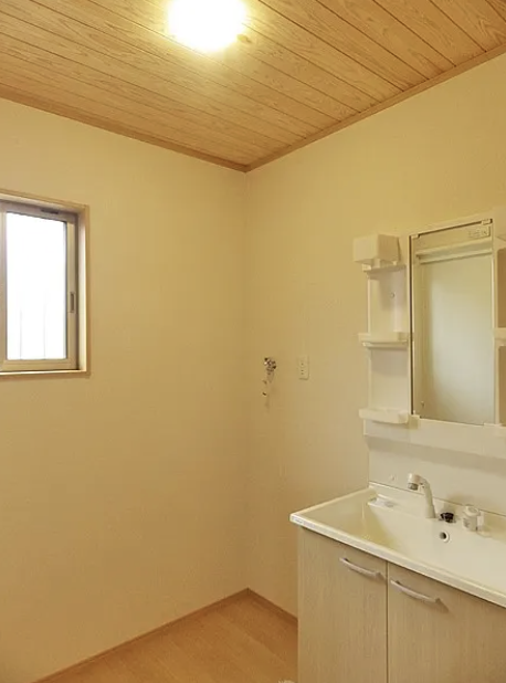 洗面脱衣室の天井の杉板は湿度を調整してくれます