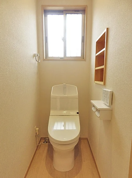 トイレの壁の棚はペーパーがぴったりと納まるサイズに作りました